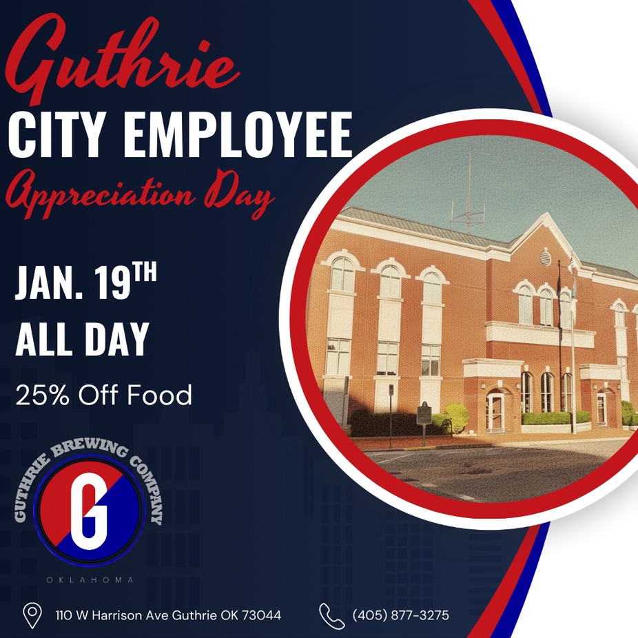 🎉 Guthrie City Employee Appreciation Day at GBC! 🎉 All day January 19th, Guthrie City employees enjoy 25% off all food. Thanks for everything you do—we’re happy to serve you! 💙